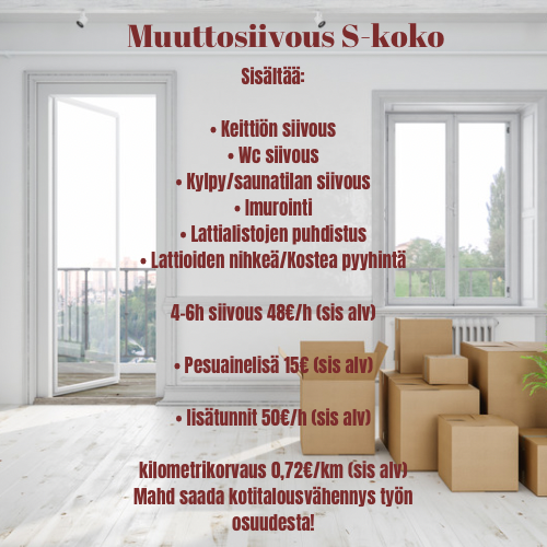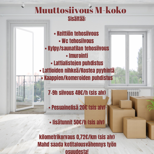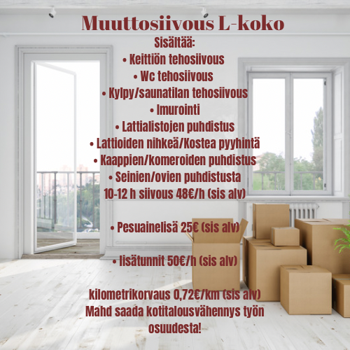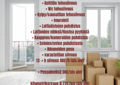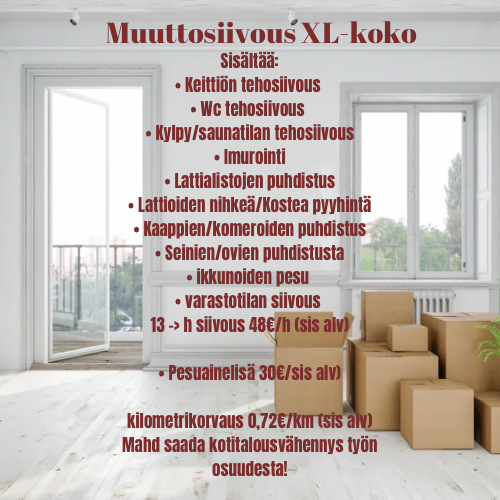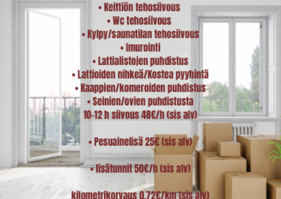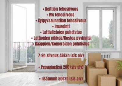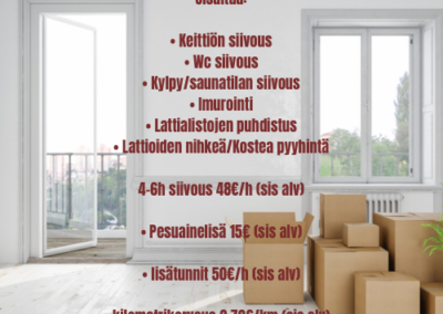 • Suursiivousten ja muuttosiivousten tarvikelisä alk. 15€/h